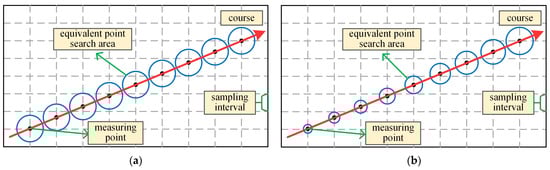 The standard TERCOM algorithm typically selects the potential drift distance of point (i.e., the final point in the INS-indicated position sequence) as the radius of the confidence interval. As shown in Figure 3a, the standard mode suffers from excessive search scope, high computational complexity, and the proliferation of false candidate points. Notably, the INS horizontal position errors accumulate over time, with the divergence rates being dependent on inertial sensor accuracy, initial alignment precision, and vehicle maneuvering trajectories. Consequently, the confidence interval radius can be dynamically adjusted based on the INS drift rates and the underwater vehicle’s navigation duration, thereby reducing the search space and improving matching efficiency, as demonstrated in Figure 3b.