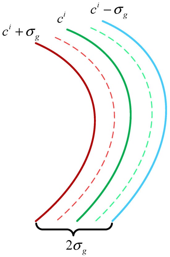 In step 3, the search for the nearest contour point to the INS-indicated position necessitates the prerequisite that the true position of the underwater vehicles lies near and resides on the contour corresponding to the measured gravity anomaly value. This implies that a standard ICCP exclusively searches for along contour , neglecting the impact of gravity anomaly measurement accuracy and background field precision. However, in practical applications, the integrated error arising from gravimeter measurements and background field inaccuracies cannot be disregarded. Consequently, the search domain must be expanded to a gravity anomaly equivalence band centered at with a bandwidth of , within which the nearest contour point to is identified, as shown in Figure 5.