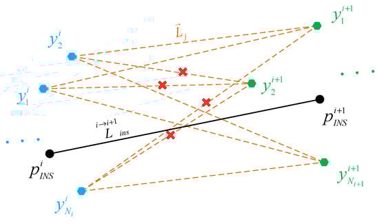 As shown in Figure 7, let and denote the INS-indicated position sequences at adjacent sampling epochs and , respectively. The contour point sets corresponding to these sequences are and , with the spacing between adjacent contour points represented as . A total of candidate connections (depicted as dashed lines) are generated. The distance between and is denoted as . During sequence-matching navigation, the spacing should approximate the actual travel distance within the sampling interval, i.e., the discrepancy must remain minimal. Notably, a higher INS accuracy results in a smaller . The dashed lines marked in red crosses in Figure 7 highlight the adjacent contour point pairs violating this positional correlation constraint.