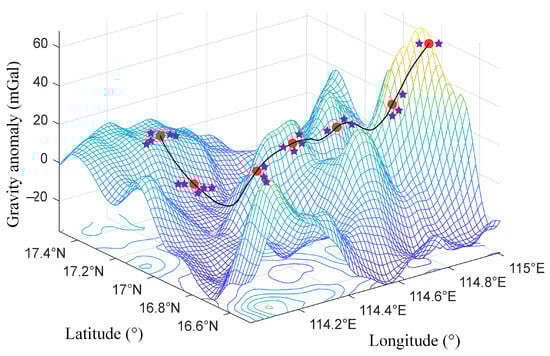 The gravity field is a continuous potential field, and gravity anomalies generally exhibit no abrupt changes at small scales. Consequently, during sequence-matching navigation, the magnitude of the gravity anomaly differences measured by gravimeters at adjacent sampling points should correlate with the gravity anomaly differences derived from adjacent contour point searches. Leveraging this property, a gravity correlation constraint is designed for adjacent sequence points, as shown in Figure 9, where the circles represent gravity anomalies at the measurement points, and the pentagrams denote the contour point search results.