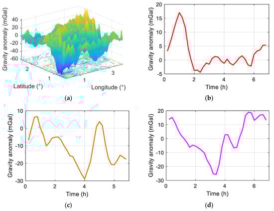 Gravity background field and trajectory gravity anomalies: (a) gravity background field in the experimental area, (b) gravity anomaly of trajectory 1, (c) gravity anomaly of trajectory 2, and (d) gravity anomaly of trajectory 3.