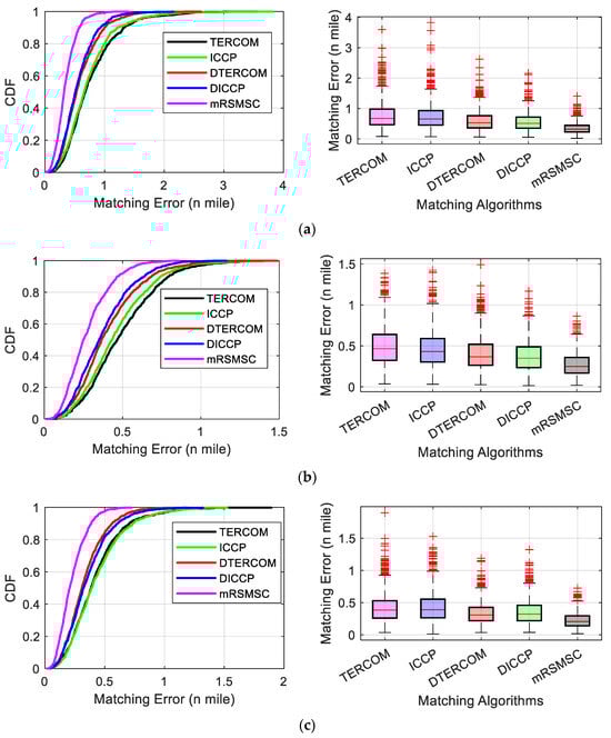 - The MAE of the mRSMSC is 0.3507 nautical miles (Traj.1), 0.2776 nautical miles (Traj.2), and 0.2276 nautical miles (Traj.3), respectively, which outperformed the TERCOM, ICCP, DTERCOM, and DICCP across all trajectories. Compared with the matching results with the smallest error among the other four algorithms (blue in the table), the mRSMSC improved by about 37.4%, 26.1%, and 32.3%, respectively, with an average improvement of about 31.9%;