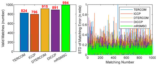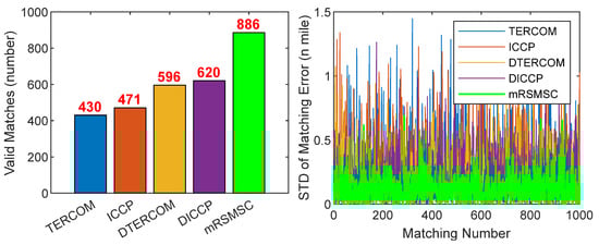 The statistics of the matching results of trajectory 1 are shown in Figure 14. Among 1000 trials, valid matches for the TERCOM, ICCP, DTERCOM, DICCP, and mRSMSC are 430, 471, 596, 620, and 886, respectively. Compared to the baselines, the mRSMSC achieves valid match rate improvements of 51.5%, 46.8%, 32.7%, and 30.0%.
