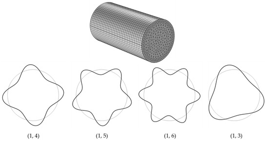 The mesh and mode shapes of the shell are illustrated in Figure 1, where the notation (m, n) represents the mode order, with m denoting the axial order and n denoting the circumferential order. It is important to note that the circumferential order n does not necessarily follow a sequential pattern.