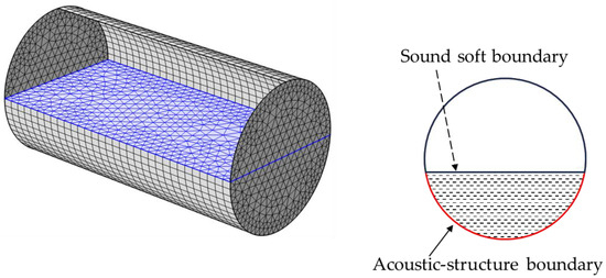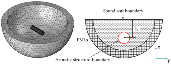 The parameters of the partially submerged shell are shown in Table 3. The depth h is expressed as the vertical length between the free surface and the center of the shell. A positive depth value indicates that the cylindrical shell is fixed above the water surface, while a negative depth value indicates that it is positioned below the water surface. FEM settings of h = −0.9 m are shown in Figure 6.