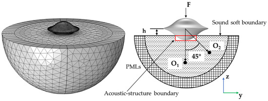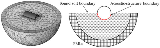 The FEM settings are subsequently extended to the half-submerged case. The computational domain is truncated by a hemisphere, and Perfect Matching Layers (PMLs) are added in the outer space to prevent the reflections back into the computational domain. FEM settings of the half-submerged case are shown in Figure 4.