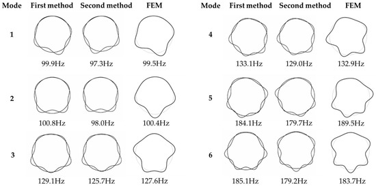 The differences are shown in Figure 3. The numerical modes agree well with experimental results [18], except for the third mode. Both sets of mode shapes demonstrate symmetry about the plane passing through the center of the shell and perpendicular to the water surface. The maximum deviations in natural frequencies between the two solutions are observed in the third and fourth modes, where the relative error reaches approximately 3%.