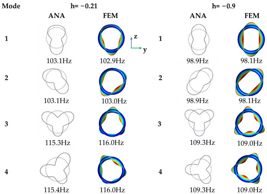 The eigenfrequencies of the first ten modes are compared between analytical and numerical solutions in Table 4 [21], where fANA and fFEM represent the analytical results and numerical results, respectively. The eigenfrequency of the same order under different depths decreases as the submerged depth increases. It tends to be steady when h = −0.9 m, which corresponds to five times the radius of the shell. The relative error between the analytical and numerical results is less than 1%.