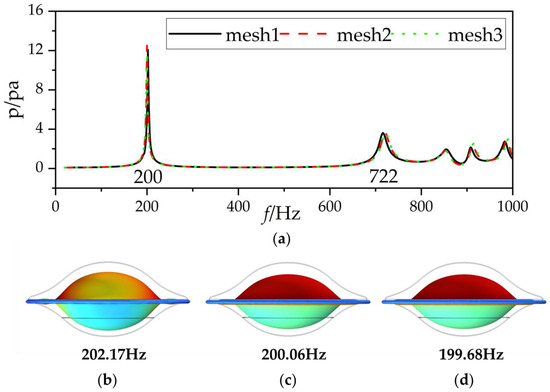 Convergence tests for the underwater glider under H’ = 0.5. (a) Comparisons of sound pressure with three meshes; (b) First formant of mesh1; (c) First formant of mesh2; (d) First formant of mesh3.
