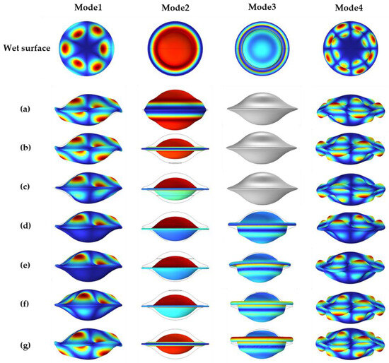 The mode shapes of the glider under seven cases are shown in Figure 12. Modes 1 and 4 can be characterized as bending vibration patterns on the surface of a disc-type shell. The water depth primarily influences the symmetry of the upper and lower sections of the shell. The presence of a heavy fluid, such as water, suppresses the shell’s vibrations, resulting in smaller vibrational displacements on the side in contact with the fluid. Mode2 represents a pure displacement vibration pattern, where the shell surface expands outward in air but contracts inward when submerged in water. Mode3 is a hybrid vibration pattern, with the upper part of the shell compressing inward and the lower part expanding outward. This mode is only observed under conditions where H’ < 0; for H’ > 0, the shell’s geometric structure replaces this behavior. These observations demonstrate that water depth has a significant impact on the characteristics of this mixed vibration mode.