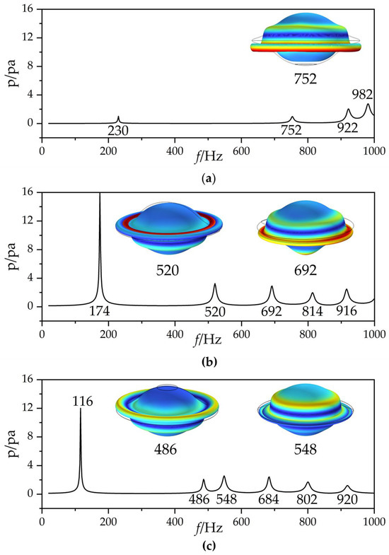 As depicted in Figure 15, the sound pressures are analyzed and compared at three distinct depths. At a depth of H’ = 0.95, four extremum points are observed at frequencies of 230 Hz, 752 Hz, 922 Hz, and 982 Hz. At H’ = 0, five extremum points are identified at frequencies of 174 Hz, 520 Hz, 692 Hz, 814 Hz, and 916 Hz. At H’ = −0.95, six extremum points are detected at frequencies of 116 Hz, 486 Hz, 548 Hz, 684 Hz, 802 Hz, and 920 Hz.