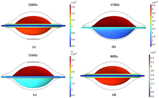 The mode shapes under four cases. (a) H’ = 0.95; (b) H’ = 0; (c) H’ = −0.95; (d) H’ = ∞, fully submerged in fluid.