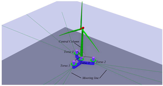 The torus-shaped WEC is the type that has been studied most extensively, featuring strong adaptability and low cost. It can convert wave energy into electrical power by taking advantage of the relative heave motion between the WEC and the platform columns while the turbine is in operation. As shown in Figure 1, the schematic diagram of the combined system illustrates that each WEC is placed in a geometrically concentric arrangement with respect to its corresponding column. The main parameters of the four torus-shaped WECs are elaborated in Table 2.