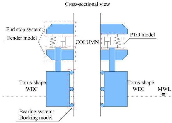 Regarding the dynamics of mechanical coupling, the FOWT and the WECs only display relative vertical motion. The remaining five degrees of freedom of the WECs are restricted by the bearing system, which serves as a horizontal limiter, and the end stop mechanism, which acts as a vertical limiter, as depicted in Figure 2. The behavior of the bearings is emulated through a combination of springs and dampers within the docking model. Meanwhile, the end stop mechanism is replaced by a fender model, which defines the maximum allowable vertical displacement as ±3 m.