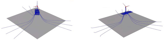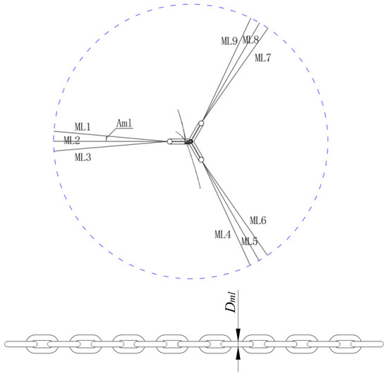 As illustrated in Figure 3, the initial 3 × 3 mooring system is initially determined by the Trial-and-Error method. Each set of three lines is connected at the fairlead with an installed azimuth angle of Aml to each respective outer column of the FOWT at a water depth of 14 m. The mooring lines extend radially towards the anchors within the surge-sway plane. The coefficients for mooring line drag and added mass, as specified in Table 4, are in accordance with the guidelines set forth by DNVGL-OS-E301 [48]. It should be emphasized that the coefficients described in the above-mentioned standards are correlated to the nominal diameter of the chain.