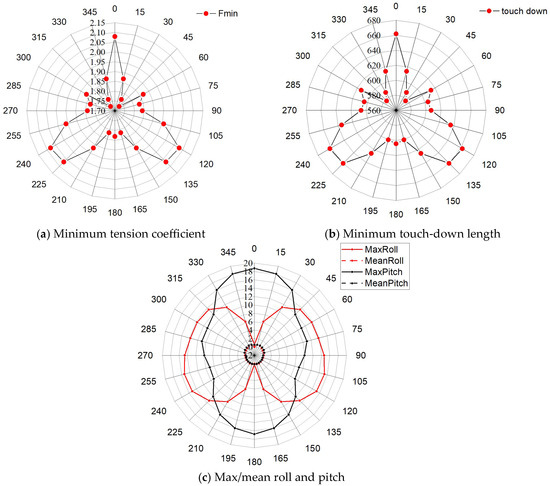 (a) Minimum tension coefficient; (b) minimum touch-down length; as well as (c), the max/mean roll and pitch in different directions due to the turbulent wind, irregular waves, and steady current in the extreme conditions.