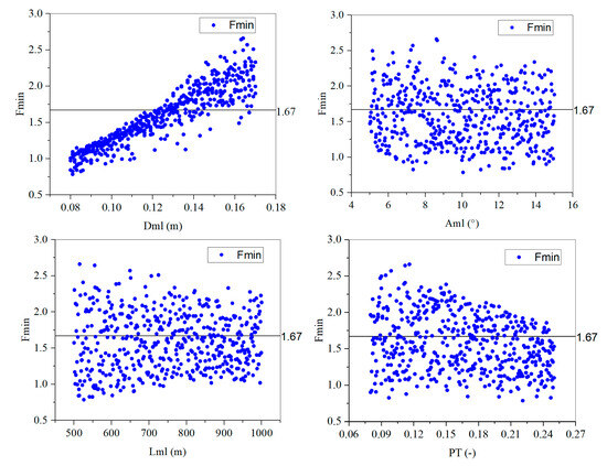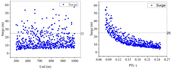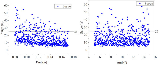 Figure 8 shows the relationship of distribution between four independent variables and the minimum tension coefficient Fmin among 500 samples in the extreme conditions. It can be seen that there is a strongly correlated linear relationship between the Dml and the Fmin. As the Dml increases, the Fmin also increases accordingly. It can also be observed from Figure 8 that the range of the sample space is relatively reasonable as the number of samples that meet the requirements accounts for about half. Figure 9 shows the distribution relationship between four independent variables and the maximum surge among 500 samples in the rated conditions. It can be seen that there is a strongly correlated nonlinear relationship between the pretension PTml and the maximum surge. As the PTml increases, the maximum surge decreases nonlinearly.