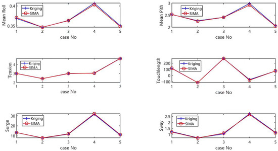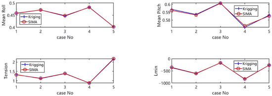 Once the results of these 500 samples are obtained, the Kriging model can be employed to build an approximate model, which can then be used to replace the SIMA simulation for predicting dynamic responses under different combinations of design variables. However, strict verification must be carried out to ensure its accuracy and reliability before applying the Kriging model. In this study, the verification of the Kriging model is based on the initial LHS samples. Specifically, 99% of the samples are selected to construct the Kriging model, while the remaining 1% of the samples are used as verification cases. Figure 10 and Figure 11 clearly show the verification results of the Kriging model and SIMA in the rated and extreme conditions. Through the verification analysis of these five samples, it can be found that the results of the Kriging model are almost exactly the same as those of SIMA. This phenomenon indicates that the Kriging model, as a surrogate model for SIMA simulation, is highly reliable and can provide relatively accurate predictions of dynamic response to support the next optimization process.