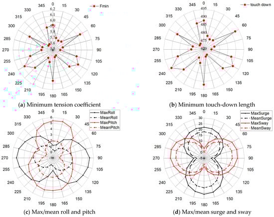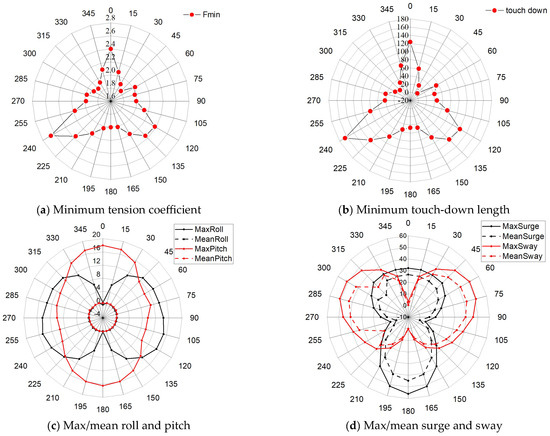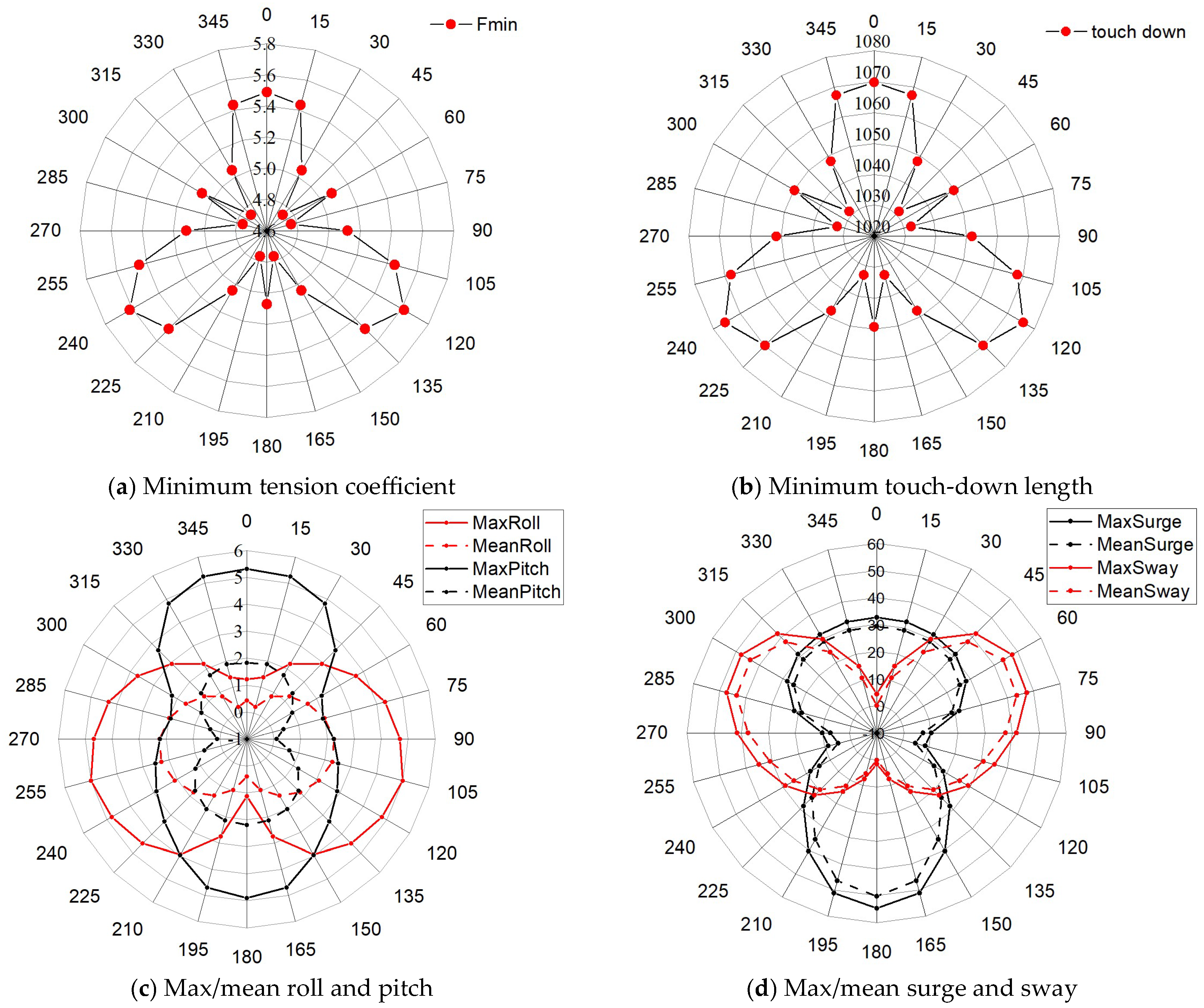 (a) Minimum tension coefficient; (b) minimum touch-down length; (c) max/mean roll and pitch; as well as (d), the max/mean surge and sway in different directions due to the turbulent wind, irregular waves, and steady current in the extreme conditions.