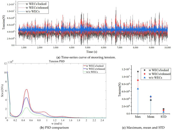 It can be found from Figure 17a that the average value of the tension response in the case with the WECs in locked mode is lower than that of the latter two cases. In this figure, the fluctuation amplitude of the black curve (without WECs) is relatively small, while the fluctuation amplitudes of the red and blue curves (with WECs) are larger. This indicates that the presence of WECs will result in a more intense variation in mooring tension.