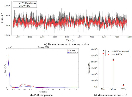 Figure 18 presents the results of the most unfavorable directions of mooring tension for the combined system under the rated conditions in two cases: with WECs in released mode and without WECs. In Figure 18a, the dynamic changes in mooring tension over time for these two cases can be witnessed. The difference in their average values is not significant, but the fluctuation amplitude of the red curve (with WECs in released mode) is relatively larger, while the fluctuation amplitude of the black curve (without WECs) is smaller, indicating that the existence of WECs will lead to more intense changes in mooring tension. Since the sea state under rated conditions is better than that under extreme conditions, the peaks of the tension spectral density curves of the two cases in Figure 18b are significantly lower compared with those in Figure 17b, which can be verified by the mooring tension statistical values in Figure 18c. The average value of mooring tension with WECs in released mode is slightly larger than that without WECs, and the maximum mooring tension increases by about 9.5%. Compared with the 35% increase under the extreme conditions, this indicates that as the severity of the sea state grows, the influence of WECs on the entire mooring system also tends to increase.