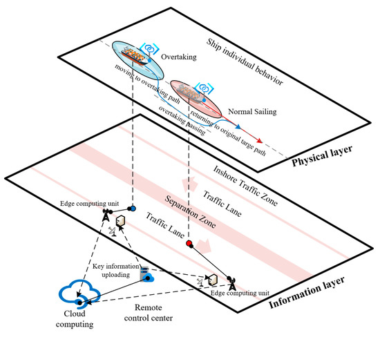 This study redefines vessel sailing behavior within the traffic separation scheme into two primary states: normal sailing and collision avoidance (as shown in Table 1). Collision avoidance is further subdivided into chasing and encountering scenarios, depending on the specific environmental and traffic conditions within the waterway. Normal sailing is the baseline state of the vessel, where it is cruising along its planned route under typical conditions, without any immediate threat from other vessels or obstacles. In this state, the vessel is moving at a constant speed and heading. The vessel is in clear water without encountering any obstacles or other vessels. The traffic in the waterway is minimal, and there are no immediate risks of collision or navigational interference. The vessel remains in the “normal sailing” state unless it detects potential obstacles, such as approaching vessels, or changes in the environment that could pose a threat. If another vessel comes too close or the environment becomes congested, the system transitions to “collision avoidance.” For example, an autonomous vessel is cruising in a broad waterway with little to no traffic. It is maintaining its course and speed. The system continuously monitors the surrounding area to ensure that no vessels are on a collision path. As long as the path remains clear, the vessel continues in the “normal sailing” state. The collision avoidance state is activated when the vessel detects a potential collision with another vessel or obstacle. The vessel will take evasive actions to prevent accidents, such as adjusting its speed or changing its course. Other vessels or objects that are on a collision course within a predefined safe distance are detected. Real-time calculation of a collision risk that exceeds the safety threshold, such as when another vessel suddenly changes course into the vessel’s path, is calculated. Once the collision risk is mitigated (e.g., the vessel has adjusted its course to avoid the other vessel), the system transitions back to “normal sailing.” For example, the autonomous vessel detects an approaching vessel from the side. To avoid a collision, it adjusts its speed and changes its course, allowing enough space to pass safely. Once the collision risk is eliminated, the vessel resumes “normal sailing.” Overtaking and head-on processes are the processes of collision avoidance. Figure 1 shows the transition from normal sailing to overtaking to normal sailing in the physical layer.