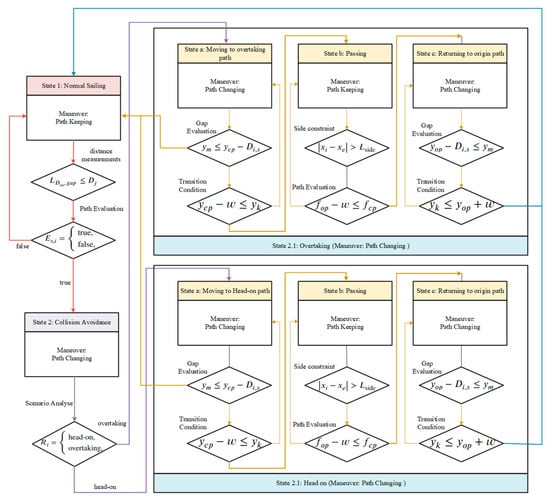 A fundamental aspect of the proposed system is the continuous safety assessment, which ensures the vessel’s behavior remains responsive to dynamic environmental factors, thereby maximizing onboard safety. At the core of this system is a conditional state machine that performs high-level decision-making, categorizing vessel behavior into three main operational states: normal sailing, overtaking, and head-on encounters. These states are designed to ensure that the vessel can safely navigate through different traffic situations, minimizing the likelihood of collision.