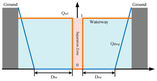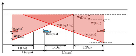 Based on the above ship domain research, vessels transiting the channel must maintain a minimum safe distance from other vessels traveling in the same longitudinal direction when navigating a channel. This process establishes the vessel’s primary axis navigation domain. Furthermore, it is imperative for vessels to uphold a prescribed minimum safe distance from other vessels in adjacent lanes within a multi-lane waterway to establish the minor axis of the vessel’s domain.