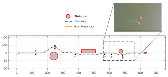 In the first real-world experiment, we evaluated the system’s performance in a simulated waterway channel with three static obstacles (two circular and one rectangular). The system demonstrated effective real-time obstacle avoidance, adapting the vessel’s path and maintaining safe distances. The autonomous vessel navigated at 4 m/s, dynamically adjusting its course to avoid obstacles. These maneuvers highlight the system’s ability to respond to environmental changes, minimizing collision risk and optimizing efficiency. However, the study did not address dynamic factors such as moving vessels or fluctuating environmental conditions (e.g., wind and waves), which require further refinement in the control algorithms to enhance performance in more variable scenarios.