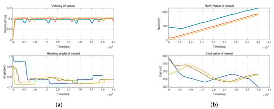 The navigation status of a vessel includes serval-dimensional state sets composed of position information (east x and north y), vessel velocity v, heading angel c, vessel decision state d, vessel control input τ, and other dynamic attributes. The expression of a vessel’s navigation state in maritime traffic is as follows: