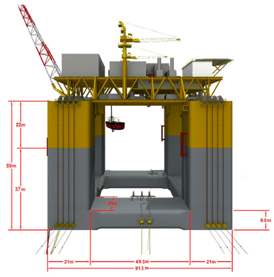 “Deep Sea No. 1” is a four-column, semi-submersible platform, with a water depth of about 1500 m, a hull draft of about 37 m, oil and gas production and processing equipment on the upper deck, underwater suspended risers and umbilical cables, and a light mooring system for positioning; the main scale parameters and data are shown in Table 1. The cross-section of the column and the pontoon section is square, and the edges of the columns are rounded, with a radius of 1700 mm.