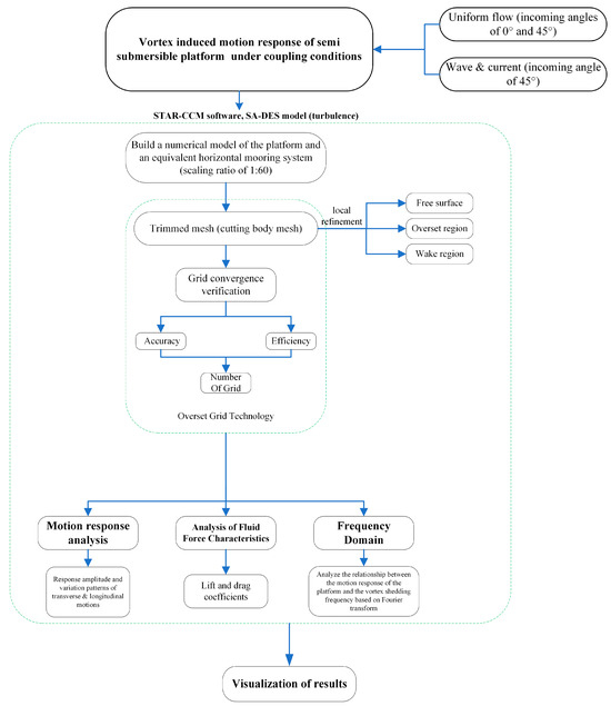 Although some progress has been made in the existing research, the study of vortex-induced motion is not systematic enough, especially the mechanism of motion under complex wave flow conditions. In view of the above, this paper further analyzes the vortex-induced motion characteristics and mechanism of the semi-submersible platform based on numerical model technology. The numerical model adopts the DES method of the SA turbulence model, and the basic idea is to use the Reynolds-Averaged Navier–Stokes method of the SA turbulence model to solve the flow in the boundary layer and the LES to solve the flow outside the boundary layer. In order to verify the reliability of the numerical model, the analysis results were compared with the model test results to achieve good consistency. The technical approach of the research is shown in Figure 2.