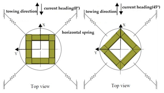 The experimental model (Figure 3) uses an equivalent horizontal mooring system (consisting of four wire ropes and springs) to provide the platform with a horizontal restoring force, so that the natural period of the model’s movement in the horizontal plane is consistent with that of the prototype platform (180 s). The numerical model (Figure 4) also uses an equivalent horizontal mooring stiffness.