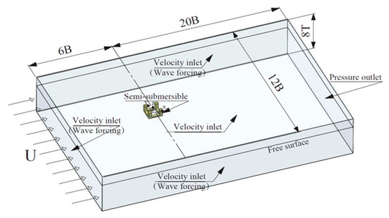 The computational domain of the numerical simulation of the semi-submersible platform is shown in Figure 5. In order to avoid sidewall effects, the entire computational domain is set to be 2.6 B × 12 B × 8 T, where B is the total width of the semi-submersible platform, T is the platform draft, the distance from the velocity inlet to the y-axis of the platform is 6 B, the distance from the pressure outlet to the y-axis is 20 B, and the distance from the platform bottom to the upper boundary of the computational domain is 3 T. The selected computational domain has been expanded based on previous studies by scholars, such as Kim et al.’s (2011) [37] study with a computational domain of 14 B × 12 B × 4.5 T, and Liu Mingyue’s (2016) [38] numerical simulation with a computational domain of 18 B × 12 B × 6 T.