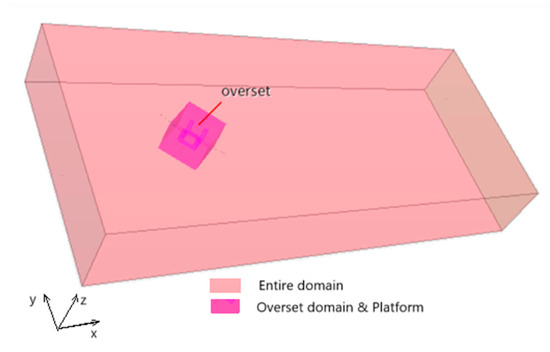 After importing the surface mesh parts into the STAR CCM software, a certain size of overset mesh domain is established near the platform, and then the entire computational domain around the periphery is established. The overset grid domain body and computational domain are assigned to the region, and finally the interface of the overset grid between the two is created, as shown in Figure 6. Subsequently, DFBI motion can be directly assigned to the overset grid domain to set the six degrees of freedom motion of the entire platform.