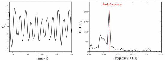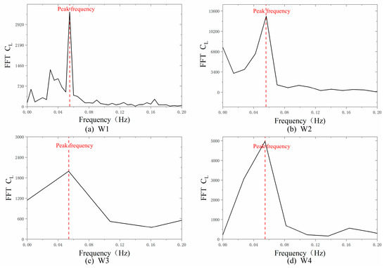 By performing a fast Fourier transform on the time history curve of lift force, the vortex shedding frequency was obtained, as shown in Figure 19. It can be clearly seen that the vortex shedding frequency of the platform is the same as the transverse motion response frequency in Figure 18, which further confirms that the transverse motion is dominated by lift force. At the same time, it is close to the natural frequency of the platform, and the vortex shedding frequency is basically not affected by regular waves. This indicates that the presence of regular waves has little effect on the frequency of vortex-induced motion on the platform, and vortex-induced motion is dominated by flow loads.