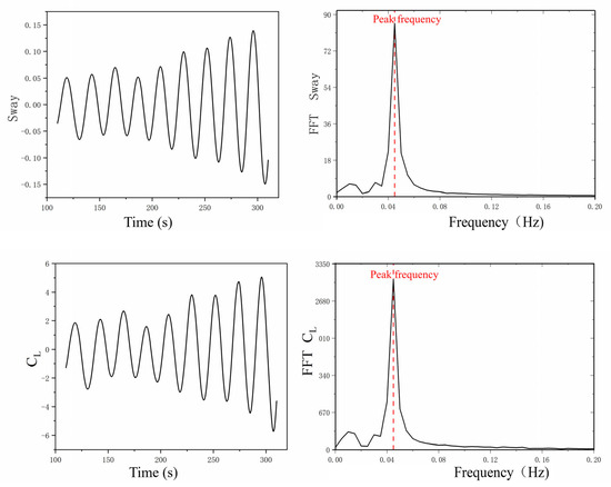 Time history curves of platform transverse motion and lift coefficients () at reduced velocity = 4 and their frequency domain analysis.