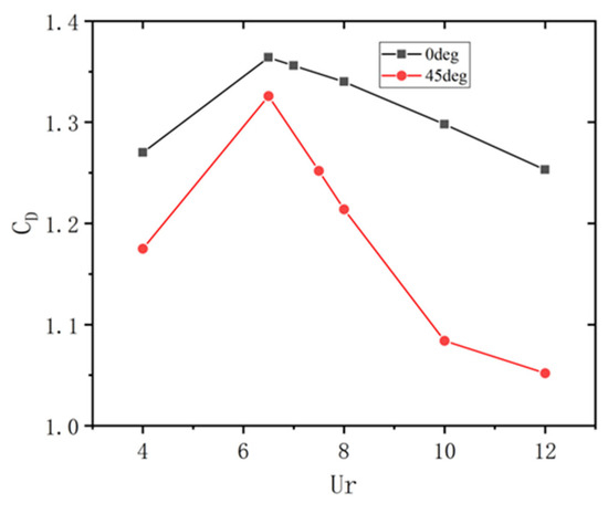 The lift force acting on the platform is generated by the periodic shedding of vortices on both sides of the platform column, resulting in a time-averaged value that is nearly zero. The pulsating lift coefficient, , is depicted in Figure 10. The pulsating lift coefficient curve in the 45° direction exhibits a pronounced downward trend. In contrast, at 0°, the change is relatively minor. However, within the reduced velocity range of , it shows a trend of initially increasing and then decreasing.