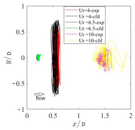 When the inflow angle is 45°, the motion trajectory of the platform in the horizontal plane (x-y) under three typical conditions is shown in Figure 15. The model test results and numerical simulation results show good consistency. The transverse motion has symmetry, and at all three reduced velocities the x-direction motion (longitudinal motion) is smaller than the y-direction motion (transverse motion). At the reduced velocity Ur = 6.5, the motion trajectory is closer to a straight line perpendicular to the flow direction. After the locking region, the transverse motion is slightly greater than the longitudinal motion, and the motion trajectory is chaotic; as the reduced velocity increases, the overall resistance of the structure increases, which leads to an increase in offset.