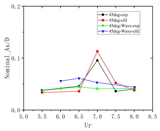 The comparison of the nominal response amplitudes of longitudinal motion under uniform flow and different reduced velocities of incoming flow coupling with regular waves is shown in Figure 17. Compared with the transverse motion response, the longitudinal motion response is not significant. However, in the locked frequency of transverse motion, there is a peak in the nominal amplitude of longitudinal motion response. This phenomenon may be due to a significant coupling between longitudinal and transverse movements, resulting in a “LOCK-IN” phenomenon in the transverse motion response, which leads to a more significant longitudinal motion response. Unlike transverse motion, the results obtained under wave current coupling are not smaller than those under uniform flow.