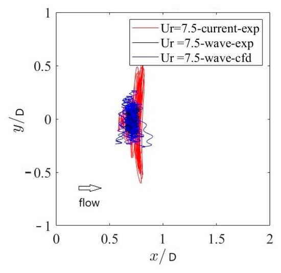 Under the combined effects of uniform flow and wave-current coupling (reduced velocity = 7.5, and incoming flow angle = 45°), the planar motion trajectory of the platform is depicted in Figure 21. The figure reveals that the presence of waves diminishes the platform’s transverse motion response, deviating from the band-like shape observed under uniform flow conditions and adopting a more square-like trajectory. The numerical simulation results align closely with the model experiment outcomes, although the trajectory exhibits a more pronounced wavy pattern and a broader planar motion range. These discrepancies highlight areas requiring further investigation.