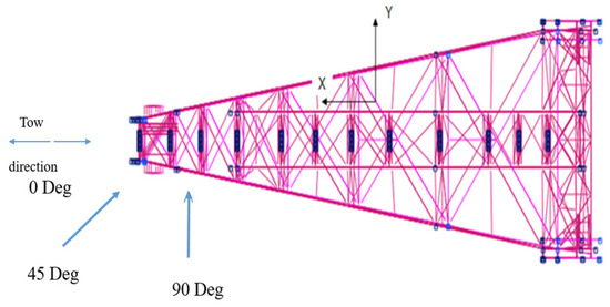 As shown in Figure 1, the origin of the absolute coordinate system is taken at the moment of the jacket’s self-motion, the intersection of the vertical line of the rocker pin shaft with the sea level, the direction along the barge lengthwise, and the -axis vertically upward. With the center of the bow of the barge as the coordinate origin, the longitudinal direction of the barge is the -axis, the port direction is the positive direction, and the vertically upward direction is the -axis. The origin of the jacket, the coordinate system, is set at the centroid of the jacket, with the -axis parallel to the pile leg in contact with the barge skid and the -axis pointing vertically upwards from . As shown in Figure 2, take the direction of 180° relative to the bow direction and 0° relative to the transom direction. Take the counterclockwise direction as the angle increases direction.