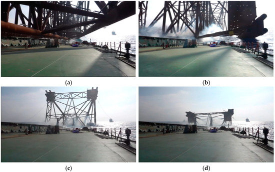 The jacket launch system consists of the jacket, transport barge, slide way, yaw arm, and various auxiliary components, such as the towing and barge ballast systems. At the start of the operation, the barge’s bow draft is 3.62 m, with a pitch angle of 4° and a mean draft of 11.5 m, as detailed in Table 1. The sliding friction coefficient between the slider and the shoe is 0.05, and the slider’s endpoint is 215 m from the bow. The analysis results confirm that the launch meets the requirements of the Noble Denton standard and project guidelines. To complement the technical description, Figure 3 presents a photograph taken at the launch site, capturing the precise moment the jacket is released from the barge, thereby offering a comprehensive view of the operational arrangement.