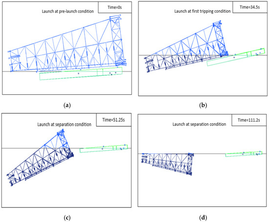 Diagram of jacket-launching process: (a) pre-launch, (b) first tripping, (c) just of separation, and (d) end of separation.
