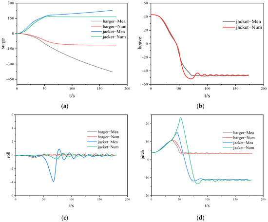 The comparison and analysis of the measured results and simulation results of the heave, sway, heave, pitch, roll, and bow sway of the barge and the jacket in the initial state are shown in Figure 5.