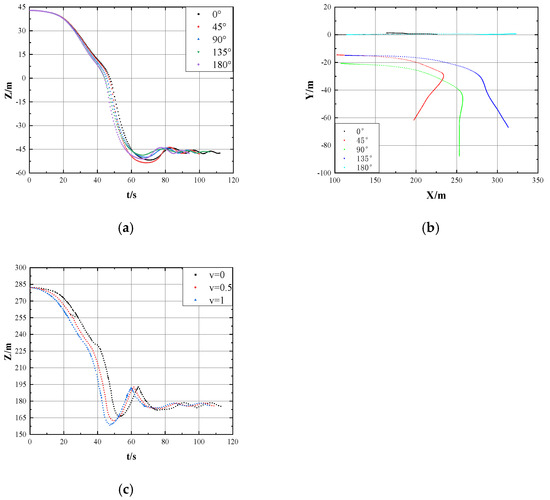Figure 6a illustrates the vertical movement of the jacket’s center of gravity during the launching of the model jacket under regular waves (wave height 1 m, period 2 s, wind speed 11.4 knots, and flow speed 1 m/s). Additionally, Figure 6b also presents the results of horizontal x-direction motion and horizontal y-direction motion, as well as the total motion trajectory of the center of gravity of the guide frame in the horizontal plane. Additionally, Figure 6c shows the variation of the z-coordinate of the center of gravity of the guide frame at different thruster speeds.