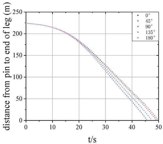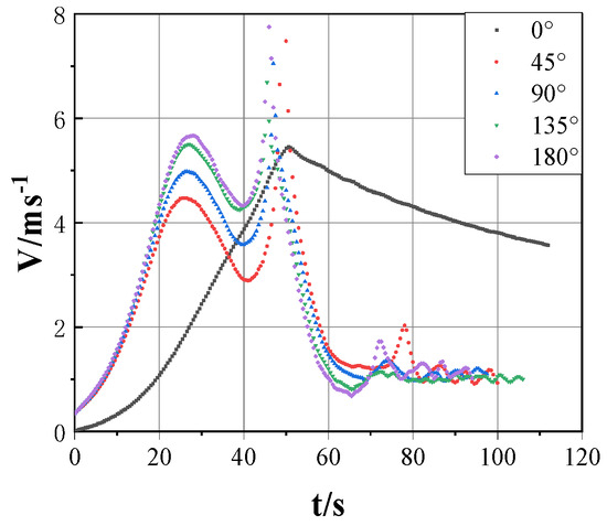 (1) By observing Figure 7, it can be found that the changing trend of velocity under the influence of 0° environmental direction is different from the curve under other environmental directions. It takes a longer time to reach the maximum speed after the jacket is detached from the pin and touches the water surface. The main reason is that the wave and wind direction in the direction of 0° environment are opposite to the direction of the water. The maximum jacket speed is achieved when the jacket slides at the tail until the pin turns.