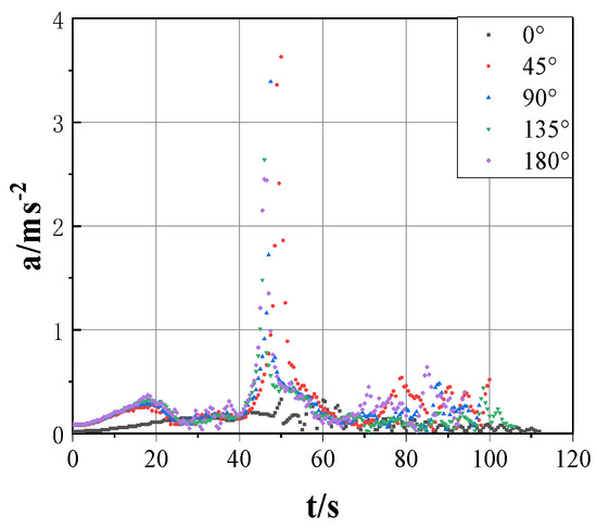 (2) By observing the acceleration curves of the jacket center of gravity under different environmental directions in Figure 8, it is found that the velocity variation images of the jacket center of gravity in the time domain show a similar trend under conditions of other environmental directions except 0°. In the initial stage, due to the force exerted by the initial speed of the booster on the jacket, the acceleration of the jacket keeps increasing. Then, in the first half of the process of sliding the jacket from the barge to the water surface, the friction of the slide rail affects the acceleration of the jacket. In the second half, the center of gravity of the jacket moves in the x-direction with time, and the acceleration of the center of gravity of the jacket increases continuously until it reaches the maximum when the jacket is released from the barge. Then, as the volume of drainage continues to increase, the buoyancy it receives increases. When the buoyancy force is greater than gravity, the jacket will move upward, and when the displacement is reduced and the buoyancy force is reduced to less than gravity, the jacket will move downward again, and it will gradually stabilize after a dynamic equilibrium. In the floating process of the jacket, the direction of the combined force of gravity and the buoyancy force is alternately positive and negative, and the magnitude of acceleration is also constantly fluctuating.