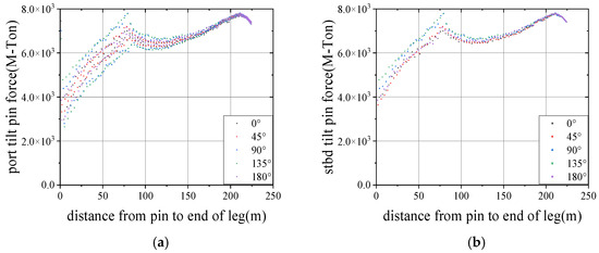(1) By observing Figure 9, it is found that the trajectory images of forces on both sides of the rocker arm have strong symmetry under the ambient directions of 0° and 180°. Additionally, the maximum and minimum forces are almost the same. On the one hand, it is because of the symmetry of the jacket structure, and, on the other hand, it is because of the symmetry of the environmental direction. Under the influence of the environmental direction of 45°, 90°, and 135°, the pressure on the left and right rocker arms is not exactly the same, and the pressure on the left side will mutate. It is mainly caused by the lateral pressure generated under the influence of wind and wave currents, and it can be found from the horizontal movement trajectory of the center of gravity of the jacket before that under the action of the inclined wind and wave currents; there is a large lateral movement, especially in the case of the maximum roll in the direction of 90°, the maximum abrupt pressure on the left side is also the largest, and it is easy to roll over everywhere jacket and barge. Therefore, avoid launching operations in this environmental direction.