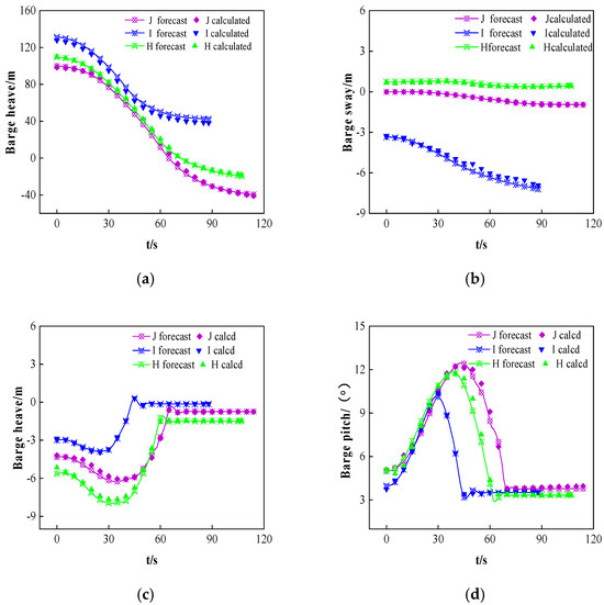 Comparison between predicted values and dataset values of barge attitude: (a) barge surge, (b) barge sway, (c) barge heave, and (d) barge pitch.